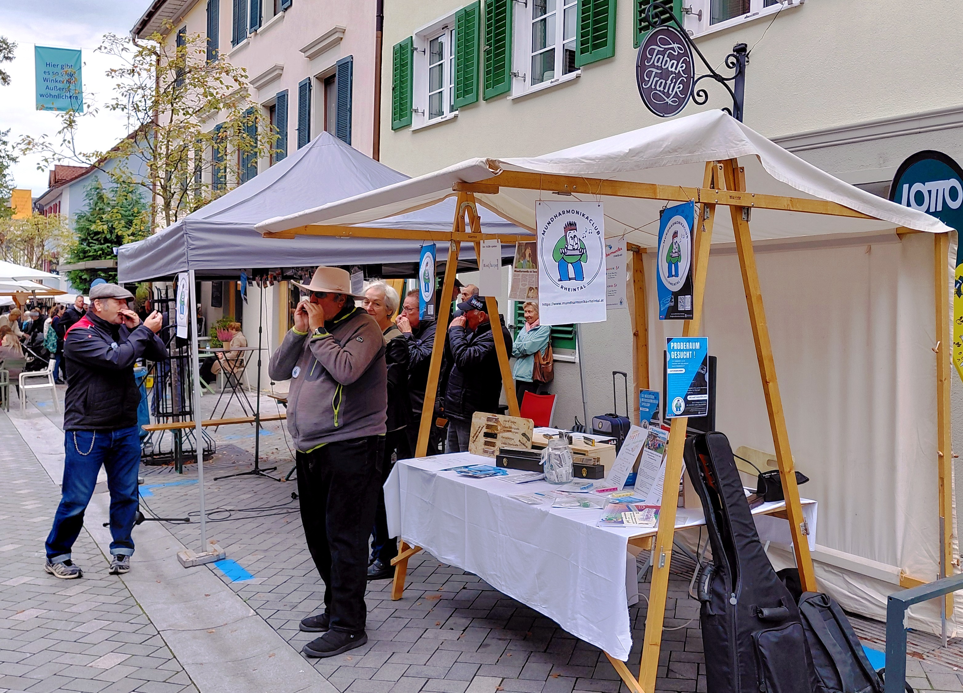Am 29. Sept. 2025 trafen sich der harte Kern des Mundharmonikaclubs Rheintal auf ihrem Stand beim traditionellen Markt in Hohenems. Als ich vor Marktstart eintraf waren schon die ersten Bluesklänge zu hören. Alles war schon aufgebaut und in Betrieb. Das Wetter war zwar nicht sonnig und ein wenig kühl aber es regnete nicht. Wir führten von Anfang an viele gute Gespräche und Diskussionen mit den vorbeiflanierenden Leuten. Kinder wurden mit unseren Gummibärchen bedacht und manch Einer interessierte sich für unseren Club. Auch spielten wir etliche Stücke von Blues über Schlager bis zu Stücken die zum Mitsingen einlud. Sogar als mir einmal mein Hut vom Kopf rutschte fanden sogar ein paar Münzen und Scheine Platz. Alles in Allem ein gelungener Auftritt. Vielen Dank all jenen die dazu beigetragen haben das dieses Event so reibungslos und gut ablief.
